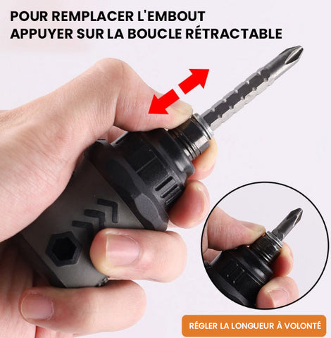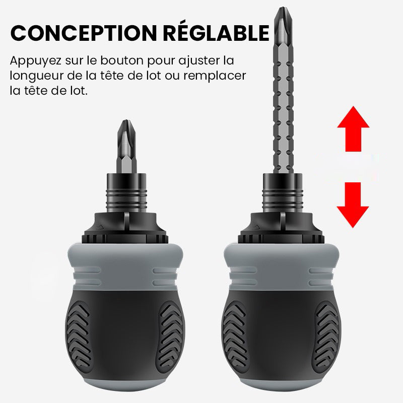 - Flexible et pratique: La longueur des embouts de tournevis est rétractable, il est donc pratique d'ajuster différentes longueurs, ce qui vous donne les caractéristiques dont vous avez besoin pour améliorer l'efficacité et l'efficience sur le chantier. Les zones tactiles de vitesse et de précision fournissent un contrôle rapide de la rotation pour des tâches efficaces d'exécution et de précision pour le tournevis à cliquet.