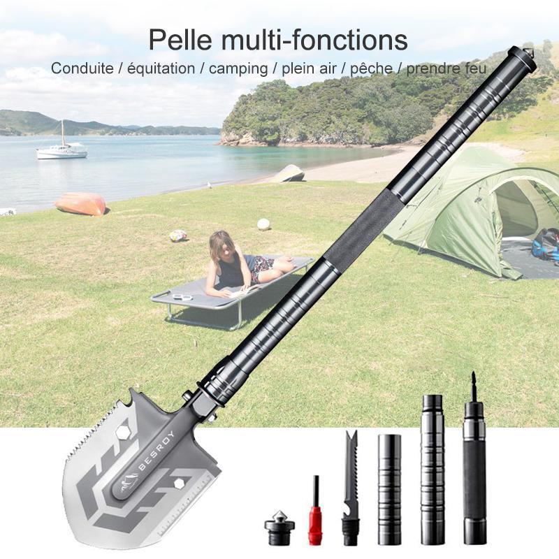 - En tant que campeurs passionnés, nous savons à quel point il peut être difficile de trouver de bons outils durables. Nous sommes toujours à l'affût de ceux qui ne prennent pas trop de place dans votre sac à dos et qui sont légers et faciles à transporter.Cela nous a conduit à créer un outil entièrement nouveau, que nous avons combiné pour en faire une pelle robuste, légère et durable. .